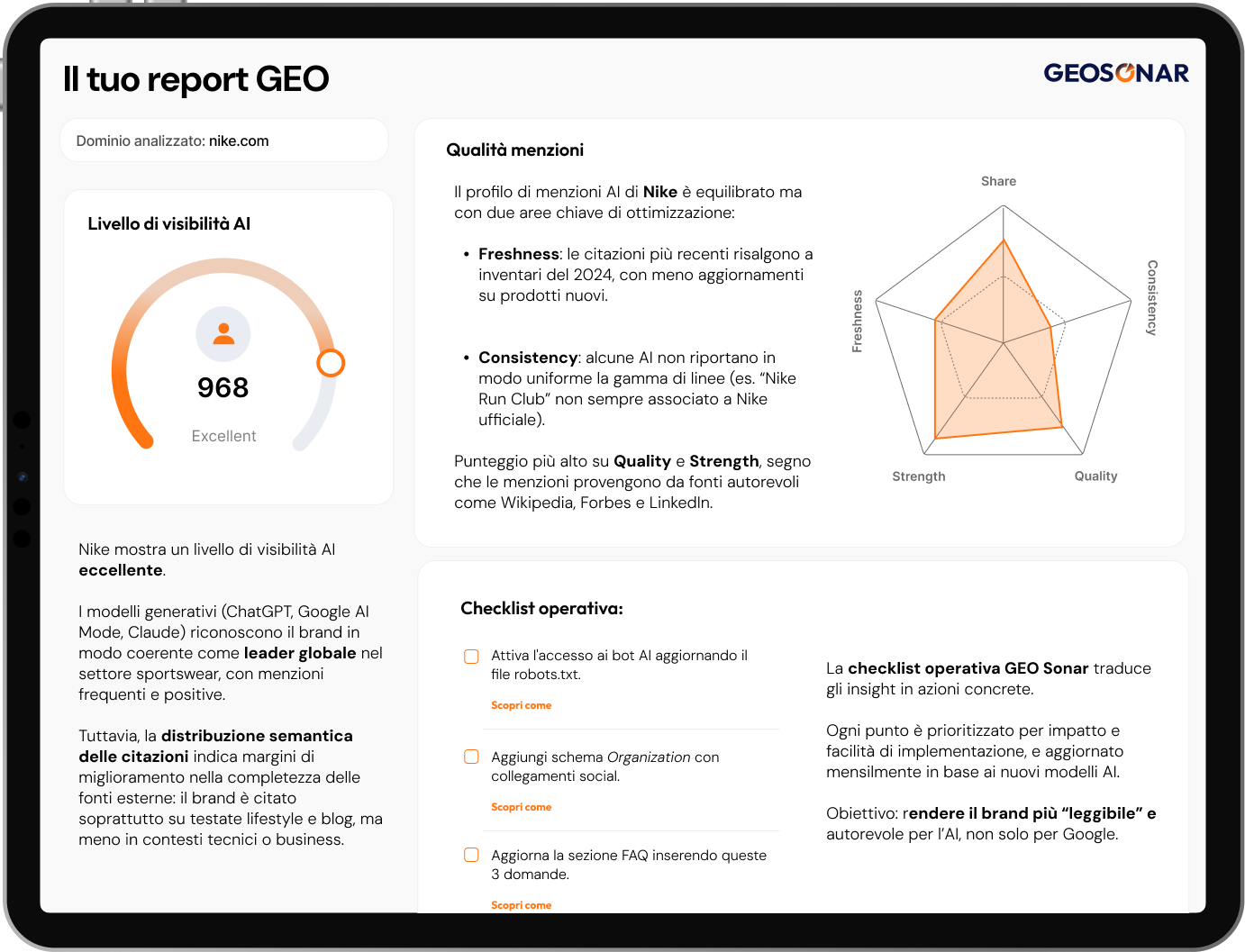 Il Report GEO è la prima analisi professionale che misura la tua visibilità sui motori AI come ChatGPT e Google AI Mode.